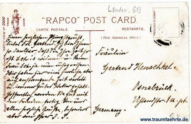 – Details – Jahr: vor 1945 Status: gelaufen, Briefmarke entfernt Beschriftung vorne: St Paul's Cathedral. Beschriftung hinten: Rapco Post Card. Carte Postale. Postkarte. ( for address only. ), Regal Art Publishing Co, City London, RapcoView No 2000, Trade Mark, Processed in Saxony Stempel: (...) Hinweis:
