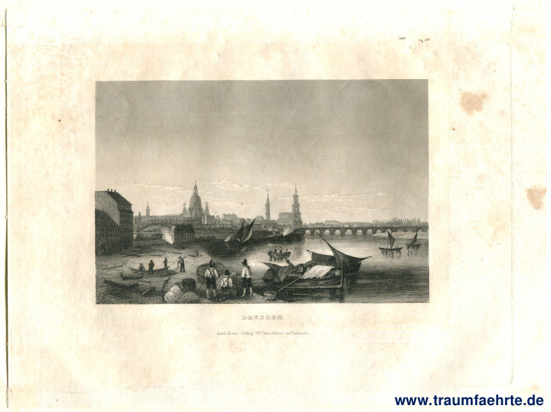 Schlagworte: Kirchen, Kuppelbauten, Türme, Schlösser, Brücken, Elbe, Flüsse, Boote, Panorama, Stahlstiche