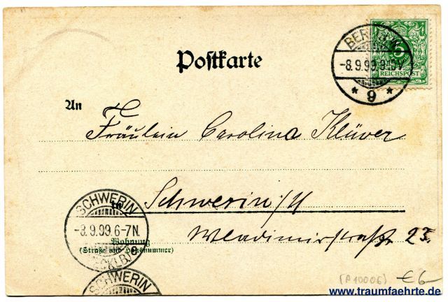 – Details – Jahr: vor 1900 Status: gelaufen 1899 Beschriftung vorne: Münch. Berlin, Lustgarten mit Denkmal Friedrich Wilhelm III Beschriftung hinten: Postkarte, An ... in ... Wohnung (Straße und Hausnummer) Stempel: Berlin, 9, – 8.9.99.9.10V; Schwerin, (Mecklb.), – 3.9.99.6-7N. Hinweis: