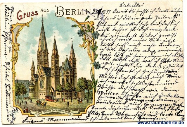 – Details – Jahr: vor 1900 Status: gelaufen 1899 Beschriftung vorne: Gruss aus Berlin, Kaiser Wilhelm Gedächtnis-Kirche. Wilhelm Stein, Berlin N. Beschriftung hinten: Deutsche Reichspost, Postkarte, An ... in ... Stempel: Birkenwerder, (Bz. Potsdam), 26.10.99(...); Rhoden, (Kr. Halberstadt), 27.10.99.9-10V. Hinweis: