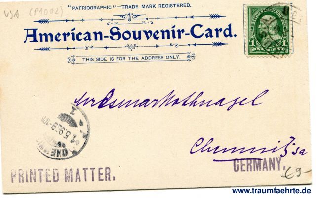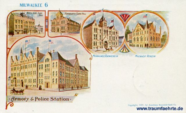 – Details – Jahr: 1897 Status: gelaufen 1898 Beschriftung vorne: Milwaukee 6, North Side Turn Hall, Vorwaerts Turn Hall, Milwaukee Turnverein, Maenner Verein, Armory & Police Station, Copyright, 1897, by American Souvenir-Card Co. 127 Duane St., New York Beschriftung hinten: Patriographic – Trade Mark Registered. American-Souvenir-Card. This side is for address only. Stempel: (...)K U.S.A. (...); Chemnitz, 1.5.9(8) 9-1(0N); Printed Matter.; Germany. Hinweis: