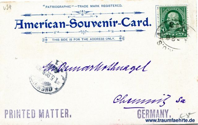 – Details – Jahr: 1897 Status: gelaufen 1898 Beschriftung vorne: Chicago 10, Art Institute Michigan Ave. Lincoln Statue. Copyright, 1897, by American Souvenir-Card Co. 127 Duane St., New York. Beschriftung hinten: Patriographic – Trade Mark Registered. American-Souvenir-Card. This side is for address only. Stempel: New York, N.Y., MAR 15, 7(...)pm, '98; \; Chemnitz, 25.3.98 11 12 (...); Printed Matter.; Germany. Hinweis: