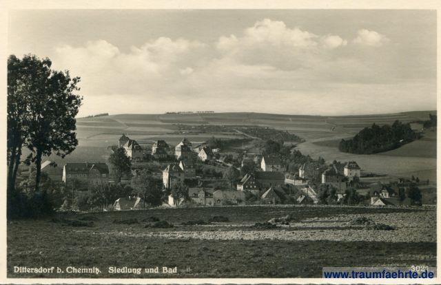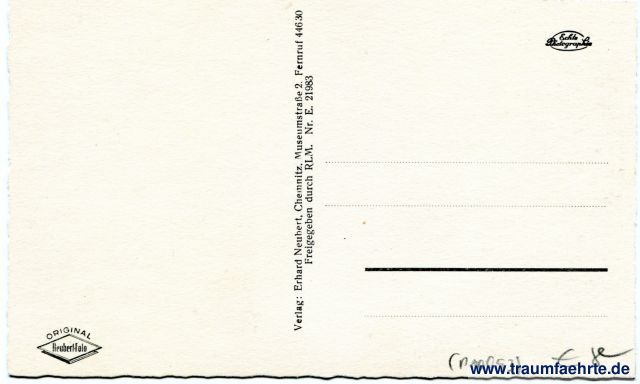 – Details – Jahr: ca. 1940 Status: ungelaufen Beschriftung vorne: Dittersdorf b. Chemnitz. Siedlung und Bad, 3021 Beschriftung hinten: Original Reubert-Foto, Echte Photographie, Verlag: Erhard Neubert, Chemnitz. Museumstraße 2. Fernruf 446 30, Freigegeben durch RLM. Nr. E. 21983 Stempel: keine Hinweis: