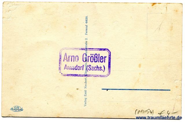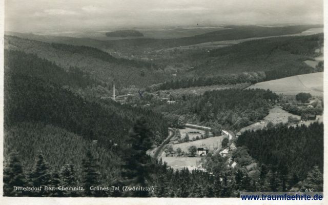 – Details – Jahr: ca. 1940 Status: ungelaufen Beschriftung vorne: Dittersdorf Bez. Chemnitz. Grünes Tal (Zwönitztal), 652 Beschriftung hinten: Echte Photographie, Verlag Emil Neubert, Chemnitz, Museumstraße 2. Fernruf 44630. Stempel: Arno Größler, Arnsdorf (Sachs.) Hinweis: