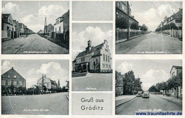Beschriftung vorne: Gruß aus Gröditz, Windmühlenstraße, Adolf-Hitler-Straße, Rathaus, Horst-Wessel-Straße, Braunauer Straße