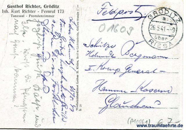 Beschriftung hinten: Gasthof Richter, Gröditz, Inh. Kurt Richter – Fernruf 173, Tanzsaal – Fremdenzimmer, Werbebilderdienst Lothar H. Kieler, Berlin-Lichterfelde, Gélieu-Straße 1, h 20, [handschriftlich:] Feldpost