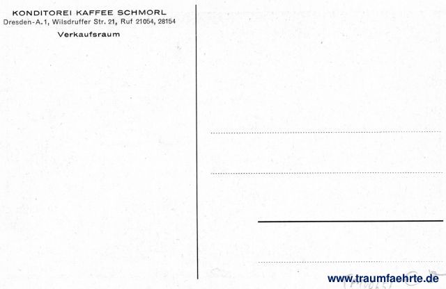 – Details – Year: ca. 1930 Postal state: postally unused Inscription front: no text Inscription back: Konditorei Kaffee Schmorl, Dresden-A. 1, Wilsdruffer Str. 21, Ruf 21054, 28154, Verkaufsraum Postmark(s): none Please note: