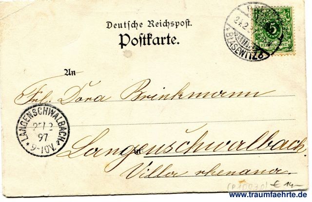 – Details – Jahr: 1897 Status: gelaufen 1897 Beschriftung vorne: Brand der Kreuzkirche zu Dresden am 16. Februar 1897 Beschriftung hinten: Deutsche Reichspost. Postkarte. An ... in ... Stempel: (Dresden-)Blasewitz (6), 24.2.97 (...)N; Langenschwalbach, 2(7) 2 97, 9-10V. Hinweis: