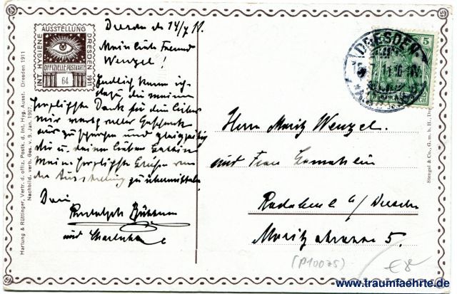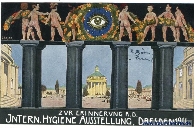 – Details – Jahr: 1907 Status: gelaufen 1911 Beschriftung vorne: Gerler. Zur Erinnerung a.d. Intern. Hygiene Ausstellung, Dresden 1911. Beschriftung hinten: Int. Hygiene Ausstellung Dresden 1911, offizielle Postkarte 64, Stengel & Co., G.m.b.H., Dr(esden), Hartung & Rüttinger, Vertr. d. offiz. Postk. d. Int. Hyg. Ausst. Dresden 1911, Nachbild. verb.Ges. v. 9. Jan. 1907 Stempel: Dresden-Altst. (...), 15.7.11.10-11V. Hinweis: