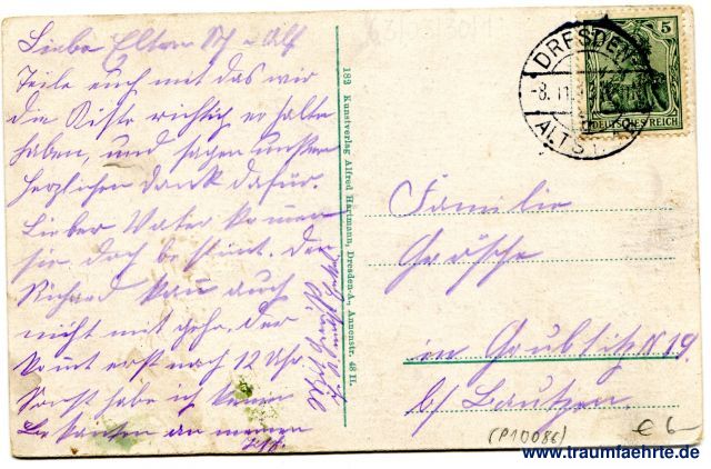 – Details – Jahr: ca. 1910 Status: gelaufen 1913 Beschriftung vorne: Dresden-Tolkewitz. Städt. Krematorium Beschriftung hinten: 182 Kunstverlag Alfred Hartmann, Dresden-A., Annenstr. 48 II. Stempel: Dresden-Altst. (...6), – 8.11.13 (10-11N) Hinweis: