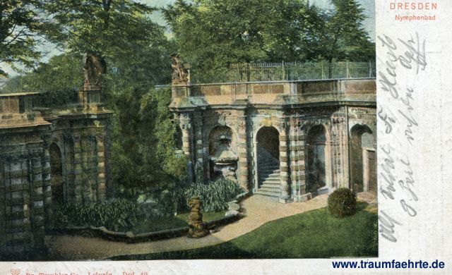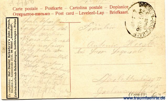 – Details – Year: ca. 1910 Postal state: postally used without stamp, 1918 (rail mail) Inscription front: Dresden, Nymphenbad, DTC, Dr. Trenkler & Co., Leipzig. Dsd. 40. Inscription back: Carte postale – Postkarte – Cartolina postale – Dopisnice, Открытое письмо – Post card – Levelezö-Lap – Briefkaart. Postmark(s): Bahnpost Dresden-Bodenbach, Zug 436, 2. 2. 18; Zu empfehlen: Hof – Dentist Schubert's Zahn – Praxis, Dresden-A., Annenstraße 23/25, im Hôtel Annenhof. Zufriedenstellende Behandlungen, Ausführungen u. Preise Please note: