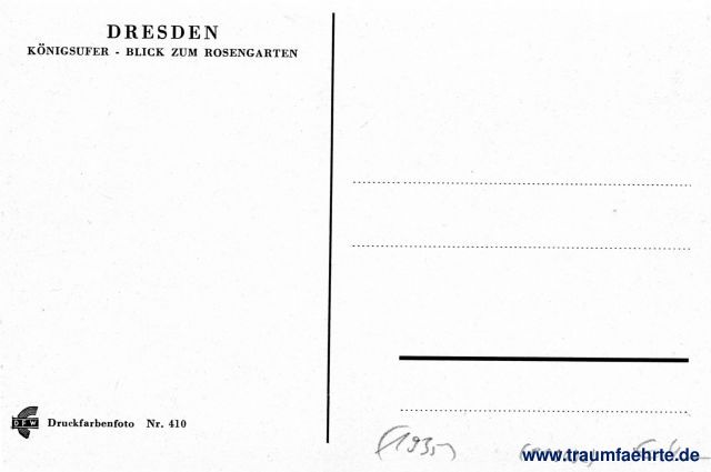 – Details – Jahr: ca. 1935 Status: ungelaufen Beschriftung vorne: kein Text Beschriftung hinten: Dresden, Königsufer – Blick zum Rosengarten, DFW, Druckfarbenfoto, Nr. 410 Stempel: keine Hinweis: