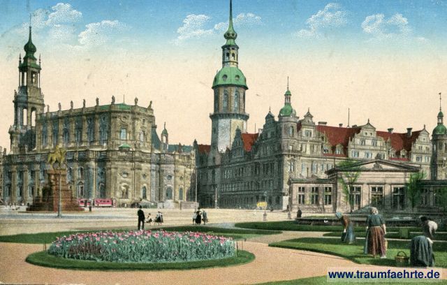 farbig – Schloss und Hofkirche, davor Reiterstandbild, Straßenbahn und Passanten, Holzgerüst am linken Rand