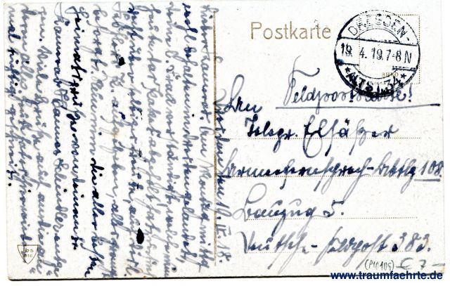 – Details – Year: 1916 Postal state: postally used without stamp (military mail), 1919 Inscription front: Dresden-N. Albertplatz. Inscription back: Postkarte, SHEO, Jbs 1916 Postmark(s): Dresden-Altst. 34, 19.5.19.7-8N Please note: