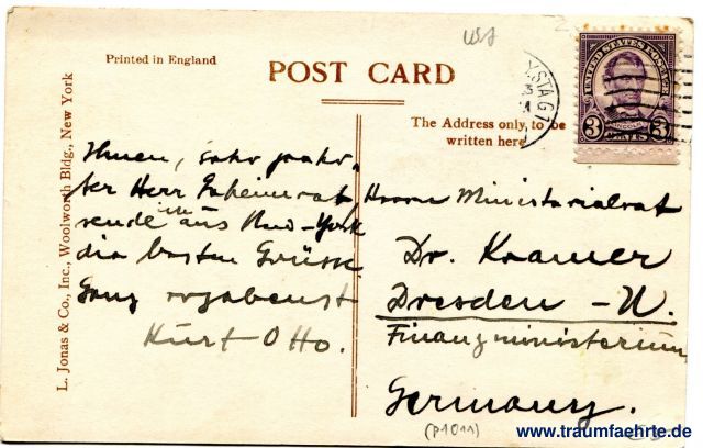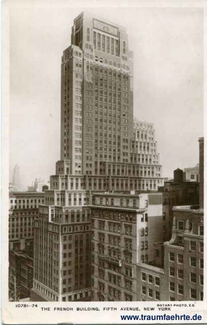 – Details – Jahr: ca. 1920 Status: gelaufen (ca. 1925) Beschriftung vorne: 10781-74, The French Building, Fifth Avenue, New York, Rotary Photo, E.C. Beschriftung hinten: Post Card, Printed in England, The Address only to be written here, L. Jonas & Co., Inc., Woolworth Bldg., New York Stempel: (...)Y.Stag 7, (...); ~~~ Hinweis: