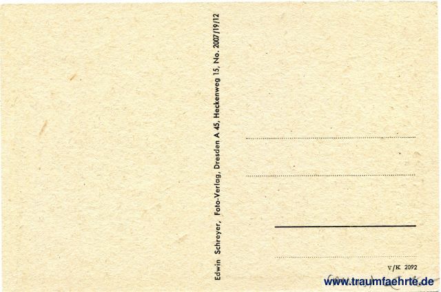 – Details – Jahr: ca. 1945 Status: ungelaufen Beschriftung vorne: Dresden, A. 47 (Ortsteil Lockwitz) Beschriftung hinten: Edwin Schreyer, Foto-Verlag, Dresden A. 45, Heckenweg 15, No. 2007/19/12, V/K 2092 Stempel: keine Hinweis: