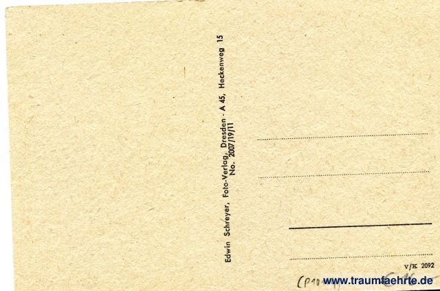– Details – Jahr: ca. 1945 Status: ungelaufen Beschriftung vorne: Dresden, A. 47 (Ortsteil Lockwitz) Beschriftung hinten: Edwin Schreyer, Foto-Verlag, Dresden – A. 45, Heckenweg 15, No. 2007/19/11, V/K 2092 Stempel: keine Hinweis: