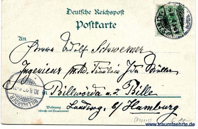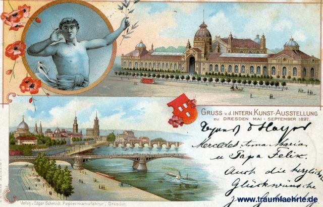 – Details – Jahr: 1897 Status: gelaufen 1897 Beschriftung vorne: Gruss v. d. Intern. Kunst-Ausstellung zu Dresden, Mai – September 1897. Verlag v. Edgar Schmidt, Papiermanufaktur, Dresden. J. Miesler, Berlin S. Beschriftung hinten: Deutsche Reichspost, Postkarte, An ... in ... Wohnung (Straße und Hausnummer) Stempel: Dresden-Altst. 3, (0), 9.8.97.5-6V.; Billwarder, 10.0.97 6-7V. Hinweis: