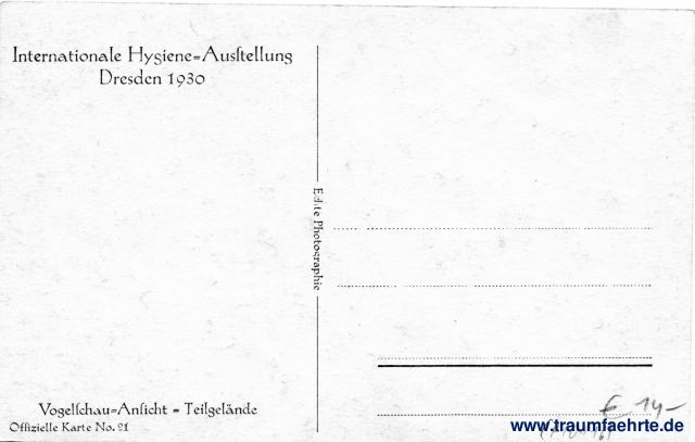Beschriftung hinten: Internationale Hygiene-Ausstellung Dresden 1930, Vogelschau-Ansicht – Teilgelände, Offizielle Karte No. 21, Echte Photographie, f U