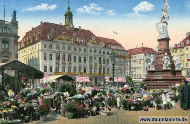 farbig – Altmarkt mit Blumenmarkt, Statue und Altem Rathaus