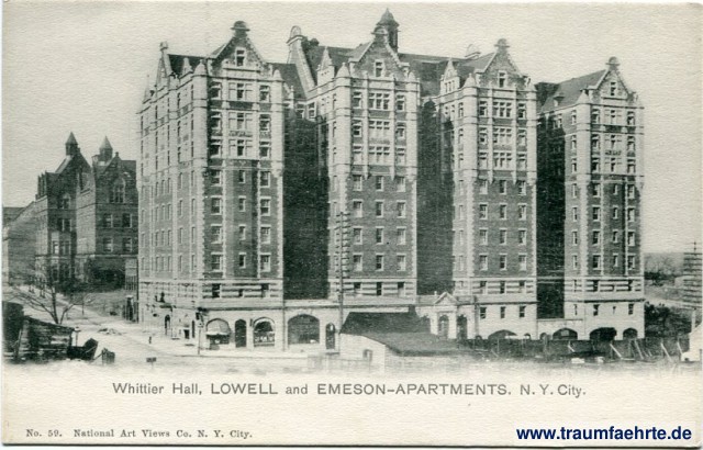 – Details – Jahr: ca. 1900 Status: ungelaufen Beschriftung vorne: Whittier Hall, Lowell and Emeson-Apartments, N.Y. City., No. 59. National Art Views Co. N. Y. City. Beschriftung hinten: Post Card, Place Stamp Here / Domestic One cent / Foreign Two cents, Germany, This side for the address. Stempel: keine Hinweis: