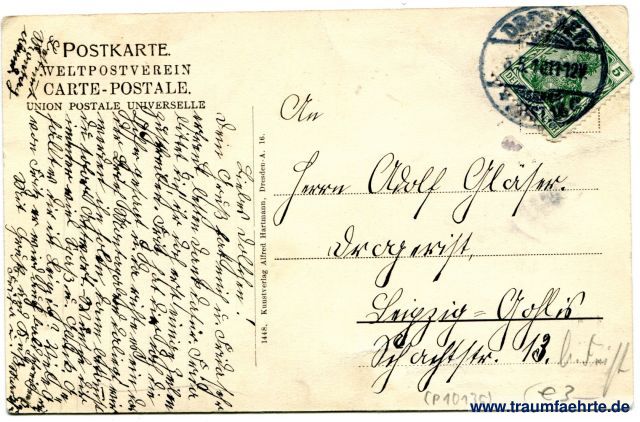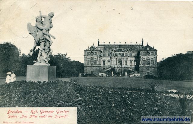 – Details – Jahr: ca. 1905 Status: gelaufen 1911 Beschriftung vorne: Dresden – Kgl. Großer Garten, Statue: Das Alter raubt die Jugend. Orig.-A. Alfred Hartmann Beschriftung hinten: Postkarte. Weltpostverein. Carte Postale. Union postale universelle. 1448. Kunstverlag Alfred Hartmann, Dresden-A. 16. Stempel: Dresden-Altst. 18, c, (5.)5.10.11-12V. Hinweis: