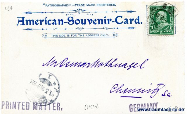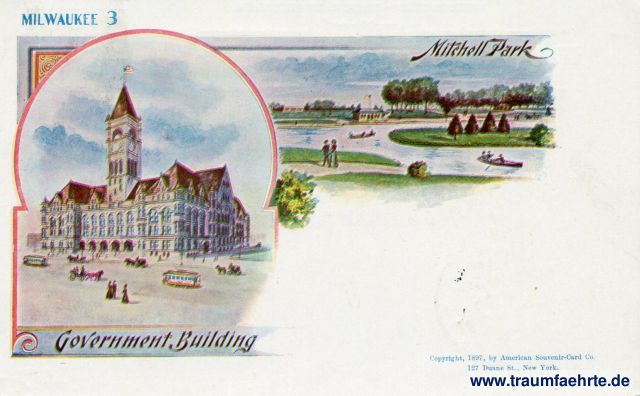 – Details – Jahr: 1897 Status: gelaufen 1898 Beschriftung vorne: Milwaukee 3, Government Building, Mitchell Park, Copyright, 1897, by American Souvenir-Card Co. 127 Duane St., New York Beschriftung hinten: Patriographic – Trade Mark Registered. American-Souvenir-Card. This side is for address only. Stempel: U.S.A. (...) 81; Chemnitz 1.5.9 8 9 – 10N; Printed Matter.; Germany. Hinweis: