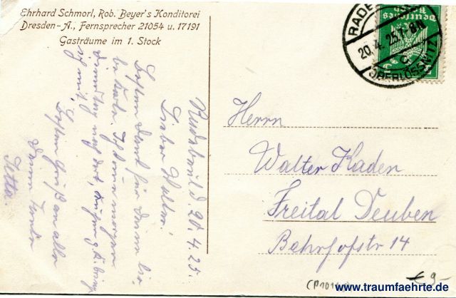 – Details – Jahr: ca. 1920 Status: gelaufen 1925 Beschriftung vorne: Erhard Schmorl, Rob. Beyer's Konditorei, Dresden-A. Gasträume im 1. Stock. Beschriftung hinten: Erhard Schmorl, Rob. Beyer's Konditorei, Dresden-A., Fernsprecher 21054 u. 17191, Gasträume im 1. Stock Stempel: Rade(berg) (Oberlössnitz),. 20.4.25.7-8N Hinweis: