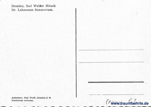 – Details – Jahr: vor 1945 Status: ungelaufen Beschriftung vorne: kein Text Beschriftung hinten: Dresden, Bad Weißer Hirsch, Dr. Lahmanns Sanatorium. Aufnahme: Paul Wolff, Dresden-A 46. Nachdruck verboten. Stempel: keine Hinweis: