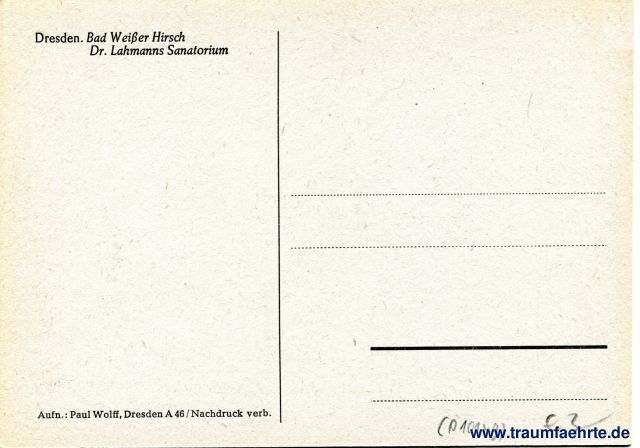 – Details – Jahr: vor 1945 Status: ungelaufen Beschriftung vorne: kein Text Beschriftung hinten: Dresden. Bad Weißer Hirsch, Dr. Lahmanns Sanatorium Aufn.: Paul Wolff, Dresden A 46 / Nachdruck verb. Stempel: keine Hinweis:
