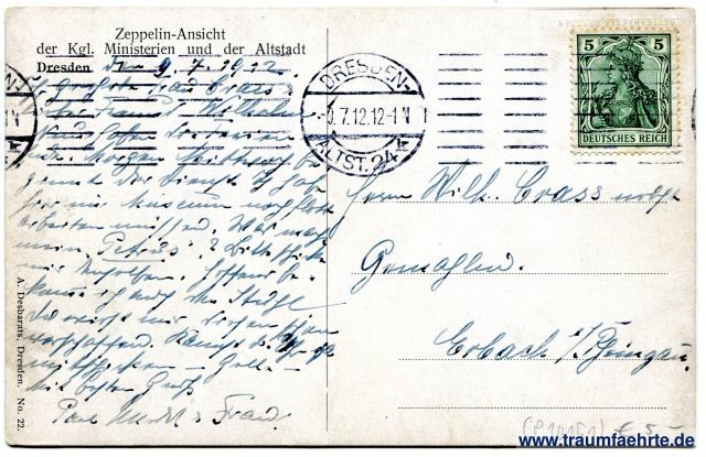 – Details – Jahr: ca. 1910 Status: gelaufen 1912 Beschriftung vorne: kein Text Beschriftung hinten: Zeppelin-Ansicht der Kgl. Ministerien und der Altstadt. Dresden, A- Desbarats, Dresden. No. 22 Stempel: Dresden-Altst. 24, k, 9.7.12.12-1N; --- Hinweis: