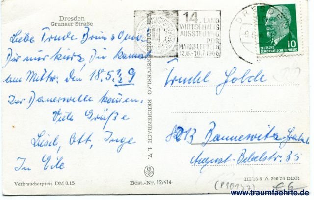 – Details – Jahr: ca. 1965 Status: gelaufen 1966 Beschriftung vorne: kein Text Beschriftung hinten: Dresden, Grunaer Straße, Verbraucherpreis DM 0.15, Best.-Nr. 12/414, III/18/6 A 246 56 DDR Stempel: 14. Landwirtschaftsausstellung DDR Markkleeberg 12.6.-10.7.1966; Dresden, 9.5.66(...) Hinweis: