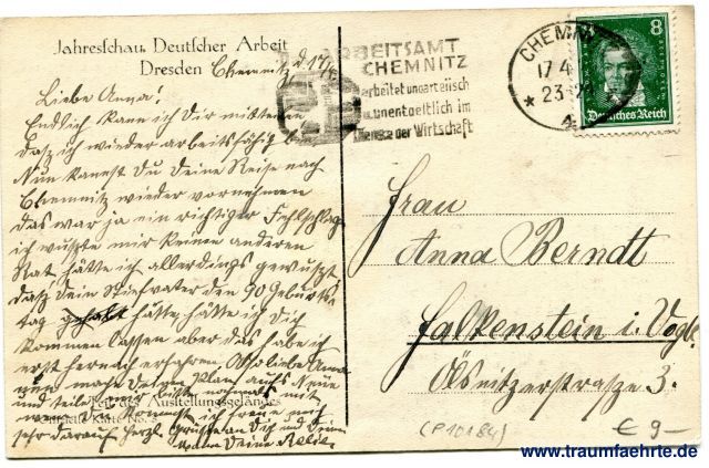 – Details – Year: 1927 Postal state: postally used (ca 1927/28) Inscription front: Stengel Inscription back: Jahresschau Deutscher Arbeit Dresden, Teil des Ausstellungsgeländes, Offizielle Karte No. 3 Postmark(s): Chemnitz, 17 4 (...). 23-24, 4; Arbeitsamt Chemnitz, arbeitet unparteiisch u. unentgeltlich im Dienste der Wirtschaft Please note: