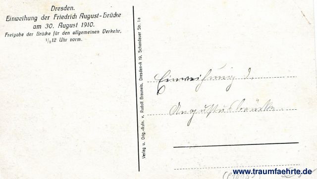 – Details – Year: 1910 Postal state: postally unused Inscription front: no text Inscription back: Dresden. Einweihung der Friedrich August-Brücke am 30. August 1910. Freigabe der Brücke für den allgemeinen Verkehr, ½12 Uhr vorm. Verlag u. Orig.-Aufn. V. Rudolf Brauneis, Dresden-A 19, Schandauer Str. 1 a Postmark(s): none Please note: