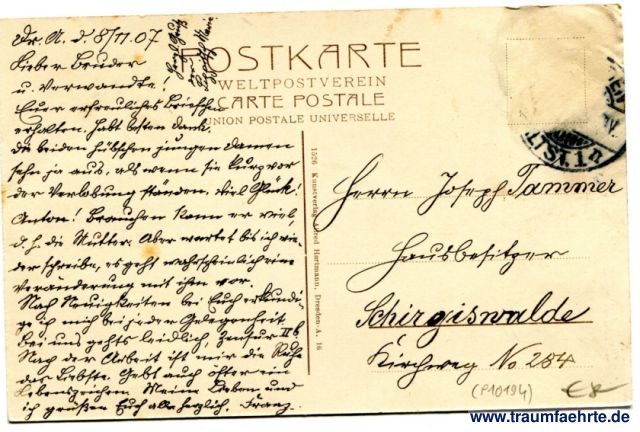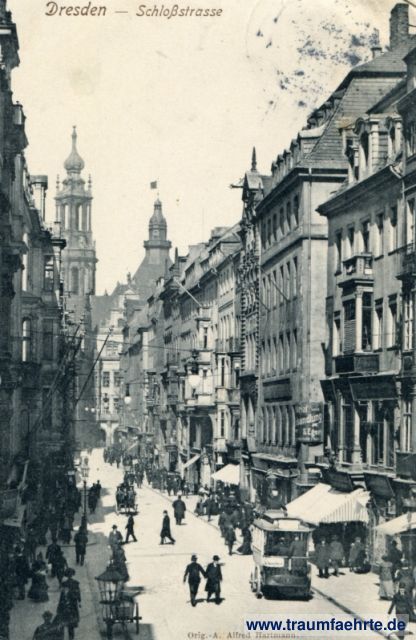 – Details – Jahr: ca. 1905 Status: gelaufen 1907, Briefmarke entfernt Beschriftung vorne: Dresden – Schloßstraße, Orig.-A. Alfred Hartmann. Beschriftung hinten: Postkarte, Weltpostverein, Carte Postale, Union Postale Universelle, 1526 Kunstverlag Alfred Hartmann, Dresden-A. 16 Stempel: (Dresden-Alst. ...) Hinweis: