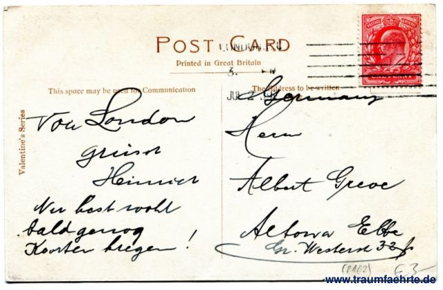 – Details – Jahr: ca. 1900 Status: gelaufen 1909(?) Beschriftung vorne: Crystal Palace, London Beschriftung hinten: Post Card, Printed in Great Britain, This space may be used for Communication, The Address to be written here, Valentine's Series Stempel: London (...), 3 (...) pm, Jul 2 (...0)9 Hinweis: