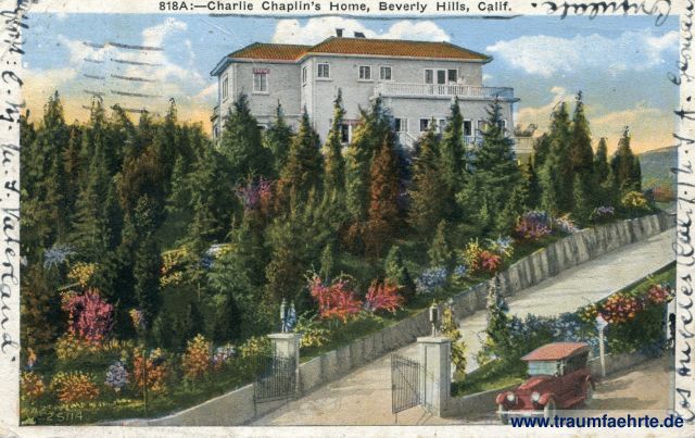 – Details – Year: ca. 1920 Postal state: postally used 1927 Inscription front: 818A: – Charlie Chaplin's Home, Beverly Hills, Calif. Inscription back: M K Post Card, This space for writing, This side for addre(ss), Pub. by the M. Kasbower Co., Los Angekes, Cal., Made in U S A Postmark(s): Los Angeles : Calif(...), Arcade Sta., AUG 13, 11 30am, 1927 Please note: