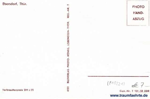 – Details – Year: ca. 1955 Postal state: postally unused Inscription front: no text Inscription back: Ebersdorf, Thür. Photo Hand-abzug, Verbraucherpreis DM 0,20, Gen.-Nr. T 131-58 DDR, 4161 Bildverlag Photo-König, Lobenstein-Thür. Reg.-Nr. 7 Postmark(s): none Please note:
