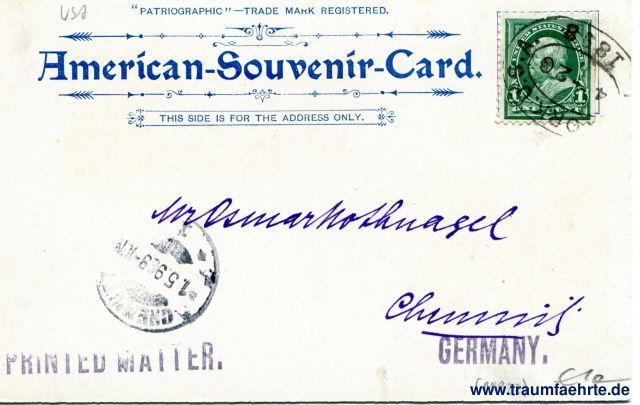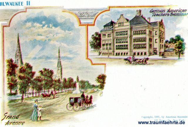 – Details – Jahr: 1897 Status: gelaufen 1898 Beschriftung vorne: Milwaukee 11, Grand Avenue, German American Teachers Seminary, Copyright, 1897, by American Souvenir-Card Co. 127 Duane St., New York. Beschriftung hinten: Patriographic – Trade Mark Registered. American-Souvenir-Card. This side is for address only. Stempel: (New York) U. S. A. 8(6)8I, 4 – 20; Chemnitz, 15.9.89 – 10N, 1; Printed Matter.; Germany. Hinweis: