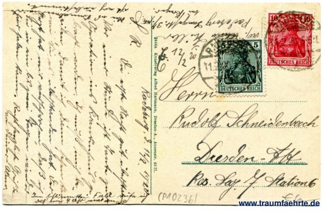 – Details – Year: ca. 1915 Postal state: postally used 1920 Inscription front: Radeberg – Neue Realschule Inscription back: 2444a Kunstverlag Alfred Hartmann, Dresden-A., Annenstr. 48II Postmark(s): 2x Radeberg (...), 11.2.20 5-6N Please note: