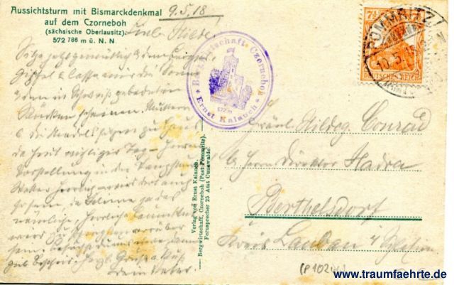 – Details – Jahr: ca. 1915 Status: gelaufen 1918 Beschriftung vorne: kein Text Beschriftung hinten: Aussichtsturm mit Bismarckdenkmal auf dem Czorneboh (sächsische Oberlausitz). 572 (786) m ü. N. N. Verlag von Ernst Kaulach, Bergwirtschaft, Czorneboh (Post Pommritz). Fernsprecher 25 Amt Cunewalde. Stempel: Pommritz (...), 10.5.18.12-1N; Bergwirtschaft Czorneboh, Ernst Kaulach, 572 m Hinweis: