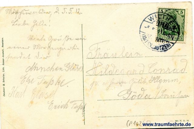 – Details – Year: ca. 1910 Postal state: postally used 1912 Inscription front: Gruss vom Mönchswalder Berg. Inscription back: Deubmer & Scholzer, Lith. Kunst-Anstalt, Bautzen. 864. N. B. 76. Postmark(s): Withen (Amtsh. Bautzen), 5.5.12.5-6N Please note: