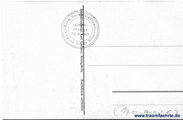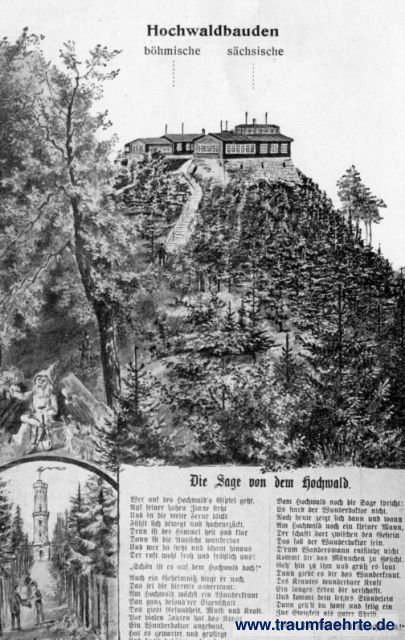 – Details – Jahr: ca. 1910 Status: ungelaufen Beschriftung vorne: Hochwaldbauden, böhmische, sächsische, Die Sage vom Hochwald, Wer auf des Hochwald's Gipfel geht, / Auf seiner hohen Zinne steht / Und in die weite Ferne blickt / Fühlt sich bewegt und hochentzückt, / Denn ist der Himmel hell und klar / Dann ist die Aussicht wunderbar / Und wer da steht und schaut hinaus / Der ruft wohl froh und fröhlich aus: / Schön ist es auf dem Hochwald doch! / Auch ein Geheimnis birgt er noch, / Das sei dir hiermit anvertraut: / Im Hochwald wächst ein Wunderkraut / Von ganz besond'rer Eigenschaft / Das giebt Gesundheit, Muth und Kraft. / Vor vielen Jahren hat das Kraut / Ein Wunderdoktor angebaut. / Hat es gewartet und gepflegt / Und hat's behütet und gehegt / Vom Hochwald noch die Sage spricht: / Es starb der Wunderdoktor nicht. / Noch heute zeigt sich dann und wann / Am Hochwald noch ein kleiner Mann, / Der schafft dort zwischen den Gestein / Das soll der Wunderdoktor sein. / D'rum Wandersmann entfliehe nicht / Kommt dir das Männchen zu Gesicht. / Geh' hin zu ihm und grüß es laut / Dann giebt es dir das Wunderkraut. / Des Krautes wunderbare Kraft / Ein langes Leben dir verschafft. / Und kommt dein letztes Stündelein / Dann geh'st du sonst und selig ein / Zur Ewigkeit als guter Christ. / Für'n Tod sein Kraut gewachsen ist! Beschriftung hinten: Kunstdruckerei Karl Liebner, Königstein. Nachdruck verboten. Stempel: Lausitzer Gebirge, 752 m hoch, Böhm. Hochwaldbaude, Carola verw. Schade Wilhelm I Hinweis:
