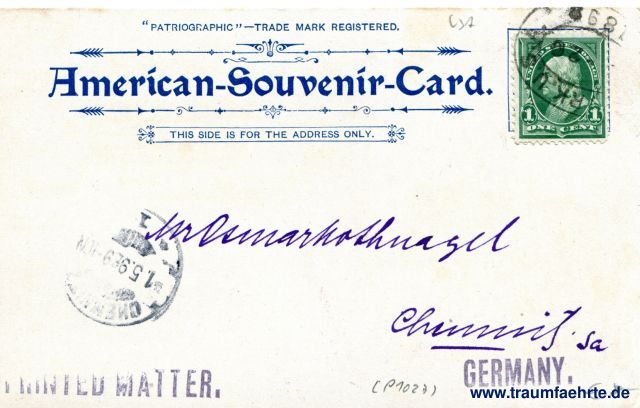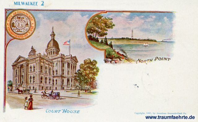 – Details – Year: 1897 Postal state: postally used 1898 Inscription front: Milwaukee 2, Court House, North Point, Copyright, 1897, by American Souvenir-Card Co. 127 Duane St., New York. Inscription back: Patriographic – Trade Mark Registered. American-Souvenir-Card. This side is for address only. Postmark(s): (New York) U. S. A. 8 6 8(I...); Chemnitz, 15.9.89 – 10N, 1; Printed Matter.; Germany. Please note: