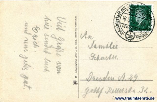 – Details – Jahr: ca. 1920 Status: gelaufen 1930 Beschriftung vorne: Kaiserschloß Mylau i.V. Göltzschtalbrücke, Eisenbahnlinie Reichenbach – Plauen i.V. Beschriftung hinten: L& Co. G, ef, Hofkunstanstalt Löffler & Co., Greiz. Geschmacksmusterschutz. Stempel: Industriestadt mit Schule für Ingenieur-Ausbildung, Zwickau (Sachsen), 16.5.30.3-4N Hinweis: