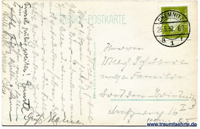 – Details – Jahr: ca. 1930 Status: gelaufen 1932 Beschriftung vorne: Chemnitz, Schlossteich mit Schloss Miranmar und Schlosskirche. 52. Beschriftung hinten: Trinks-Postkarte, Trinks & Co., G.m.b.H., Leipzig. Ges. gesch. Echte Photographie Stempel: Chemnitz, a 1 t, 23.5.32. 6-7 Hinweis: