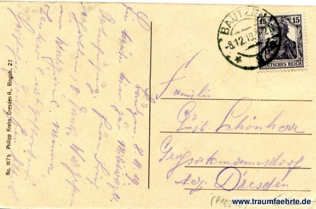 – Details – Jahr: ca. 1915 Status: gelaufen 1919 Beschriftung vorne: Bautzen, Spree mit Kronprinzenbrücke und Petrikirche Beschriftung hinten: No. 1117 b, Philipp Krebs, Dresden-A., Ringstr. 23 Stempel: Bautzen, -8.12.19.1-2N Hinweis: