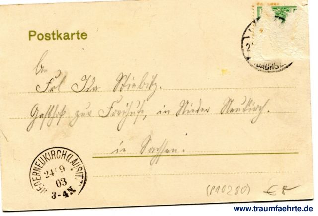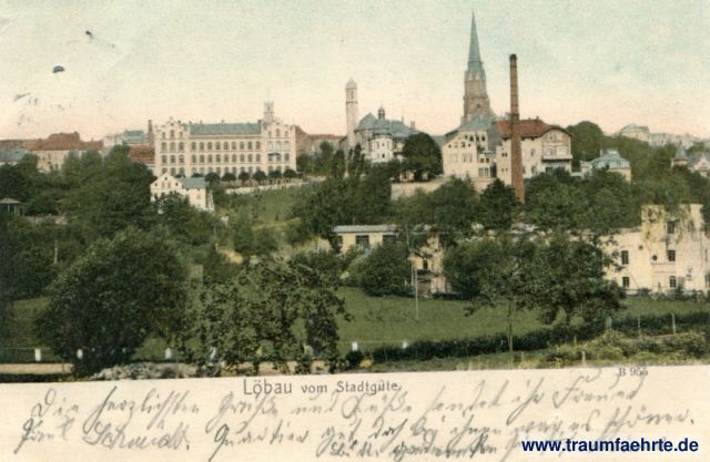 – Details – Jahr: ca. 1900 Status: gelaufen 1903 Beschriftung vorne: Löbau vom Stadtgute. B 955 Beschriftung hinten: Postkarte Stempel: (...) (Sachsen); Niederneukirch (Lausitz), 24 9 03, 3-4N Hinweis: