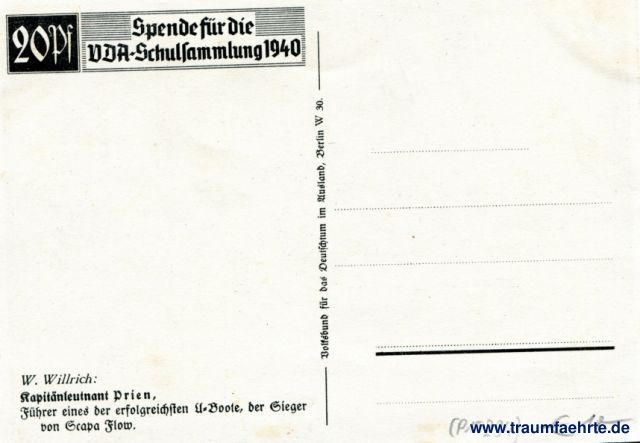 Beschriftung hinten: 20 Pf, Spende für die VDA-Schulsammlung 1940, W. Willrich: Kapitänleutnant Prien, Führer eines der erfolgreichsten U-Boote, der Sieger von Grapa Flow, Volksbund für das Deutschtum im Ausland, Berlin W 30.