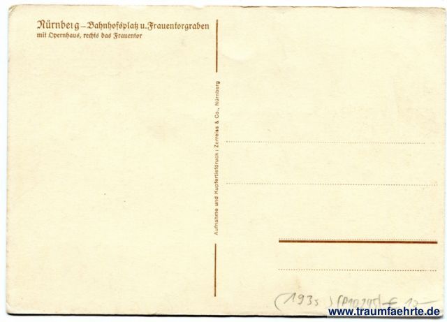 Beschriftung hinten: Nürnberg – Bahnhofsplatz u. Frauentorgraben mit Opernhaus, rechts das Frauentor, Aufnahme und Kupfertiefdruck: Zerreiss & Co., Nürnberg